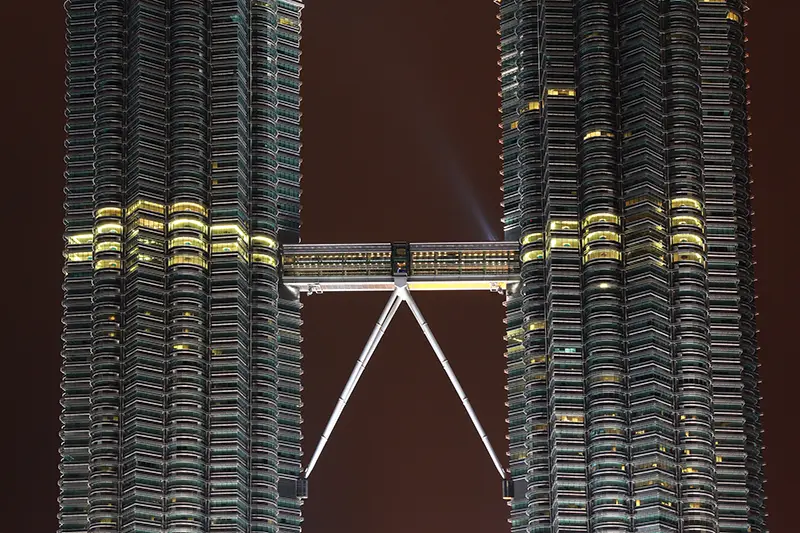 Each tower is supported by a unique structural system designed to withstand high winds and provide stability. The Skybridge, a defining feature of the towers, not only connects the two structures but also serves as an emergency exit route. The towers’ shimmering stainless steel and glass façade captures and reflects light beautifully, making them a mesmerizing sight during the day and a dazzling beacon at night.